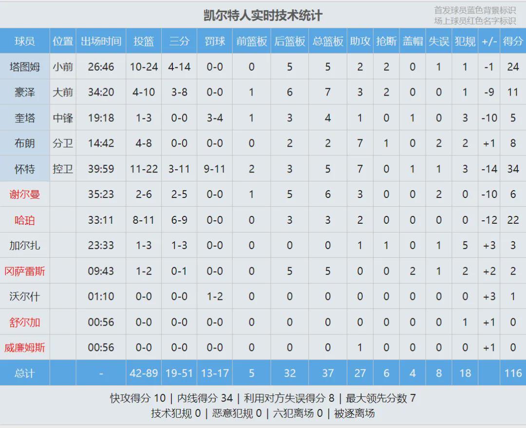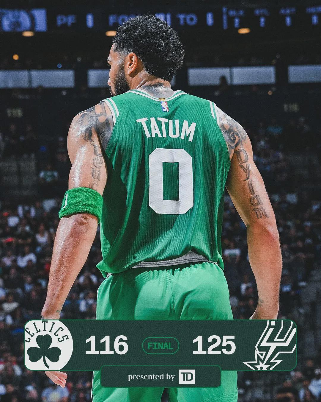 这是塔图姆复出之后的第三场比赛,此役塔图姆出战27分钟,投篮24中10,三分球14中4,得到24分5篮板2助攻2抢断1失误1犯规,末节独得10分依然无力回天。怀特22投11中,砍下赛季新高的34分,外加5篮板7助攻1盖帽。