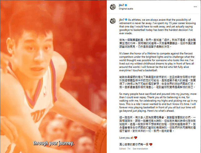 2025年8月31日,林书豪在微博发布了一封深情的告别信。37岁的他,终于说出了那个迟迟不愿面对的词:“退役”。
